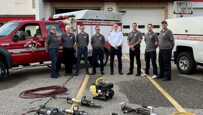 The Eagle Valley Rescue Society presented the jaws to Sean Coubrough, the CSRD Regional Fire Chief, in support of the district’s new road rescue service in the Shuswap. The equipment was donated Thursday, Oct. 2 at the Sicamous Fire Rescue Hall.
